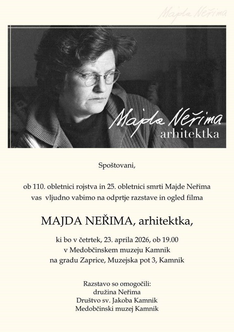 MAJDA NEŘIMA, ARHITEKTKA, ki bo v četrtek, 23. aprila 2026, ob 19. uri v Medobčinskem muzeju Kamnik na gradu, Muzejska pot 3, Kamnik.