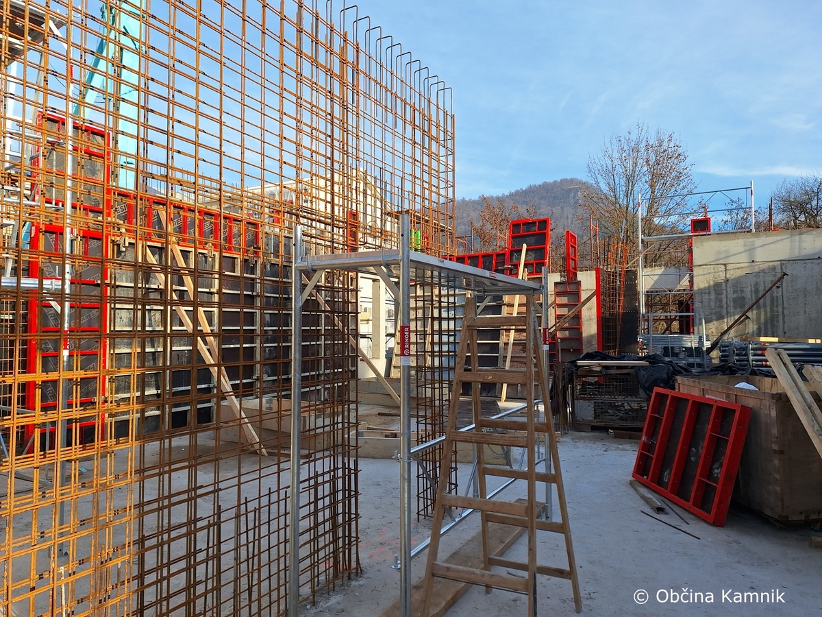 Prav tako se nadaljujejo dela na objektu knjižnice. Izvajalec je nadaljeval z montažo opažnega sistema za namen betoniranja sten pritličja.