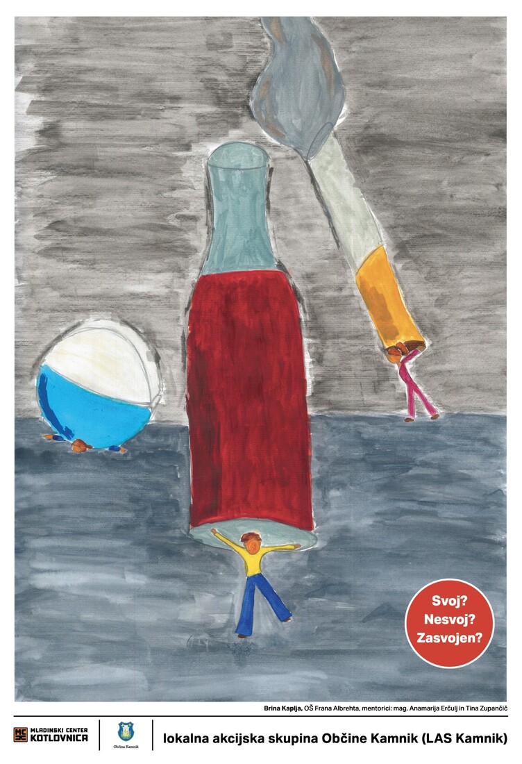Brina Kaplja (OŠ Frana Albrehta, mentorici: mag. Anamarija Erčulj in Tina Zupančič) v svojem plakatu prikazuje nevarnosti različnih kemičnih odvisnosti, kot so alkoholizem, kajenje in zloraba zdravil. Pod simboli steklenice, cigarete in tablete je upodobila stisnjene človeške figure, ki ponazarjajo ujetost in nemoč zasvojenih. Bogata ilustracija, prežeta s teksturami in barvnimi poudarki, je komisijo prepričala s svojo izrazno močjo.