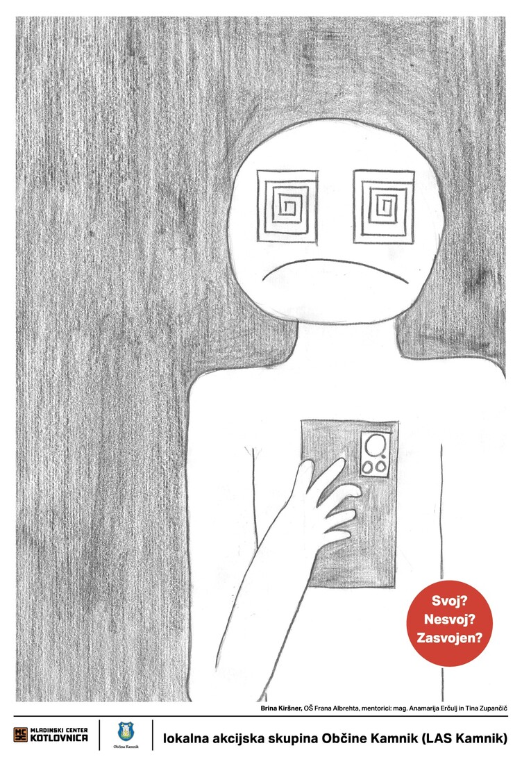 Brina Kiršner (OŠ Frana Albrehta, mentorici: mag. Anamarija Erčulj in Tina Zupančič) opozarja na nesnovno odvisnost od elektronskih naprav, ki je med mladimi vse bolj razširjena. Z izčiščeno in jasno vizualno podobo izpostavi, kako lahko telefoni prevzamejo pozornost, zmanjšajo družabnost ter otežujejo odklop od digitalnega sveta. Preprost, a učinkovit plakat je komisiji izstopal zaradi močnega sporočila in premišljene izvedbe.