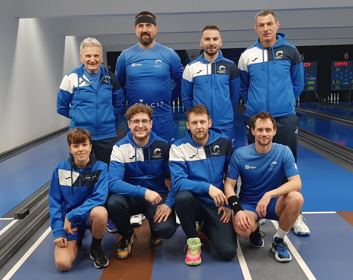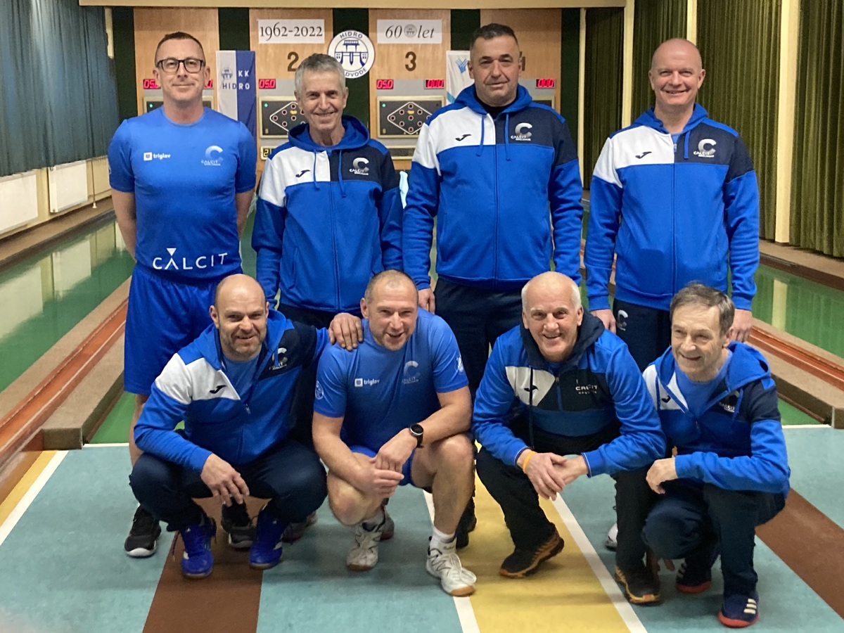 Takoj za to tekmo so se fantje iz prve ekipe pomerili z Adrio. Čeprav so bili na papirju favoriti, so bili zaradi nekoliko slabših predstav na zadnjih dveh tekmah zaskrbljeni. Kaj kmalu pa se je pokazalo, da so bile skrbi odveč. Tekmo so za Calcit začeli Jure Starman, Franci Grubar in Gašper Burkeljca. Fantje so začeli odločno in že v prvem setu ob vseh treh dobljenih set točkah napravili razliko 46 kegljev. Ta se je do konca le še večala in na koncu znašala nedosegljivih 233 kegljev! Fantje so oddali le dve set točki, vsi pa so tudi presegli mejo 600 podrtih kegljev. Gašper 646, Jure 641 in Franci 606. Zelo dober obet za nadaljevanje, v katerem so nastopili Matic Babnik, Miha Uršič in Igor Zamljen. Tudi v tem delu je bila slika podobna, le z nižjimi rezultati. Izkazal se je Miha Uršič, ki je končno prišel do svoje prave igre iz z osebnim ligaškim rekordom 612 podrtih kegljev gladko zmagal. Tudi Matic (543) ni imel večjih težav, Igor (591) pa je ekipno točko priboril dobesedno v zadnjem metu. 8:0 za Calcit in odličen ekipni rezultat 3639 podrtih kegljev.