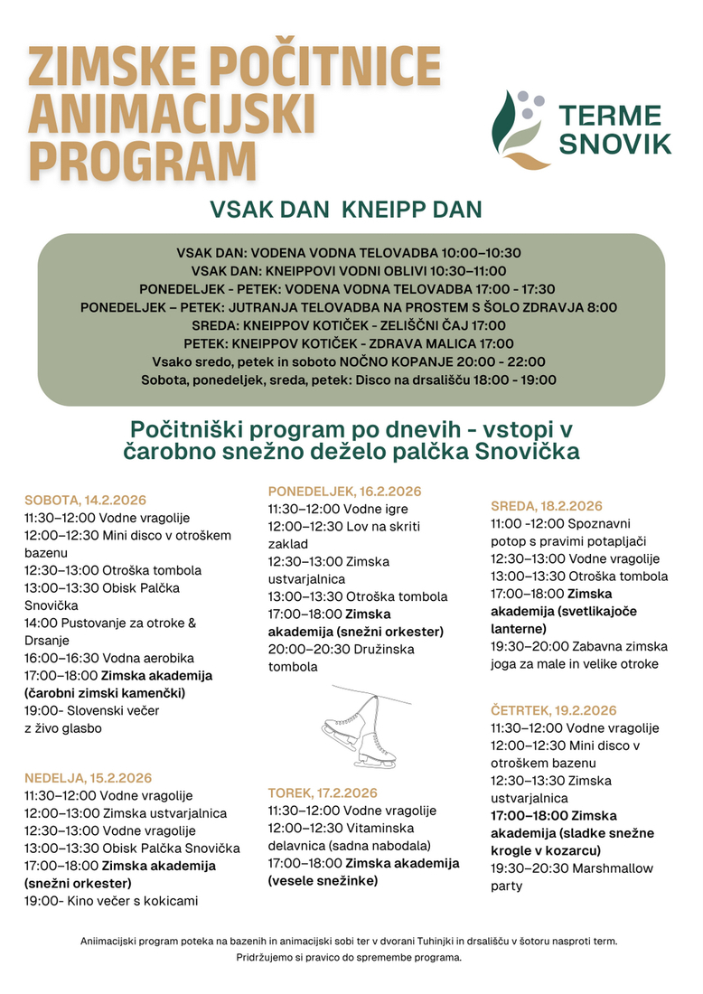 V Termah Snovik med zimskimi šolskimi počitnicami otrokom in osnovnošolcem ponujajo bogat program, ki je v celoti brezplačen za obiskovalce bazena in apartmajske goste. Otroci se lahko vsak dan vključijo v ustvarjalne, glasbene in kulinarične delavnice v okviru Čarobne snežne akademije, kjer nastajajo zimski kamenčki, glasbila za snežni orkester, unikatne snežinke, svetleče lanternice in sladke snežne krogle v kozarcu. Vse delavnice vodijo izkušeni animatorji, zato otroci ves čas ustvarjajo v varnem, vodenem in sproščenem okolju, kar staršem omogoča, da si privoščijo trenutke zase v termalni vodi ali wellnessu.