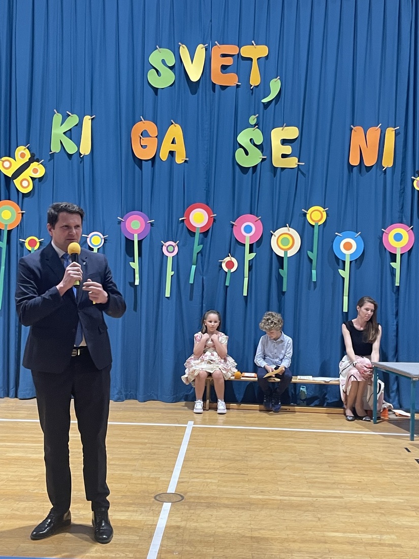 V svojem nagovoru je župan Matej Slapar poudaril plemenito poslanstvo učiteljev ter izrazil hvaležnost celotnemu kolektivu šole za organizacijo sproščene in nepozabne prireditve. Posebej je izpostavil pomen vključevanja takšnih dogodkov v program občinskega praznika ter vsem zbranim iskreno čestital ob prazniku.