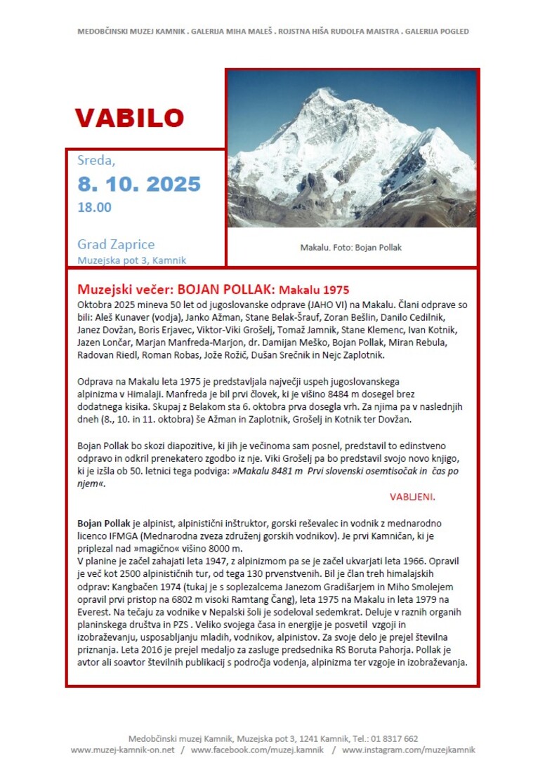 Bojan Pollak bo skozi diapozitive, ki jih je večinoma sam posnel, predstavil to edinstveno odpravo in odkril prenekatero zgodbo iz nje. Viki Grošelj pa bo predstavil svojo novo knjigo, ki je izšla ob 50. letnici tega podviga: »Makalu 8481 m Prvi slovenski osemtisočak in čas po njem«.