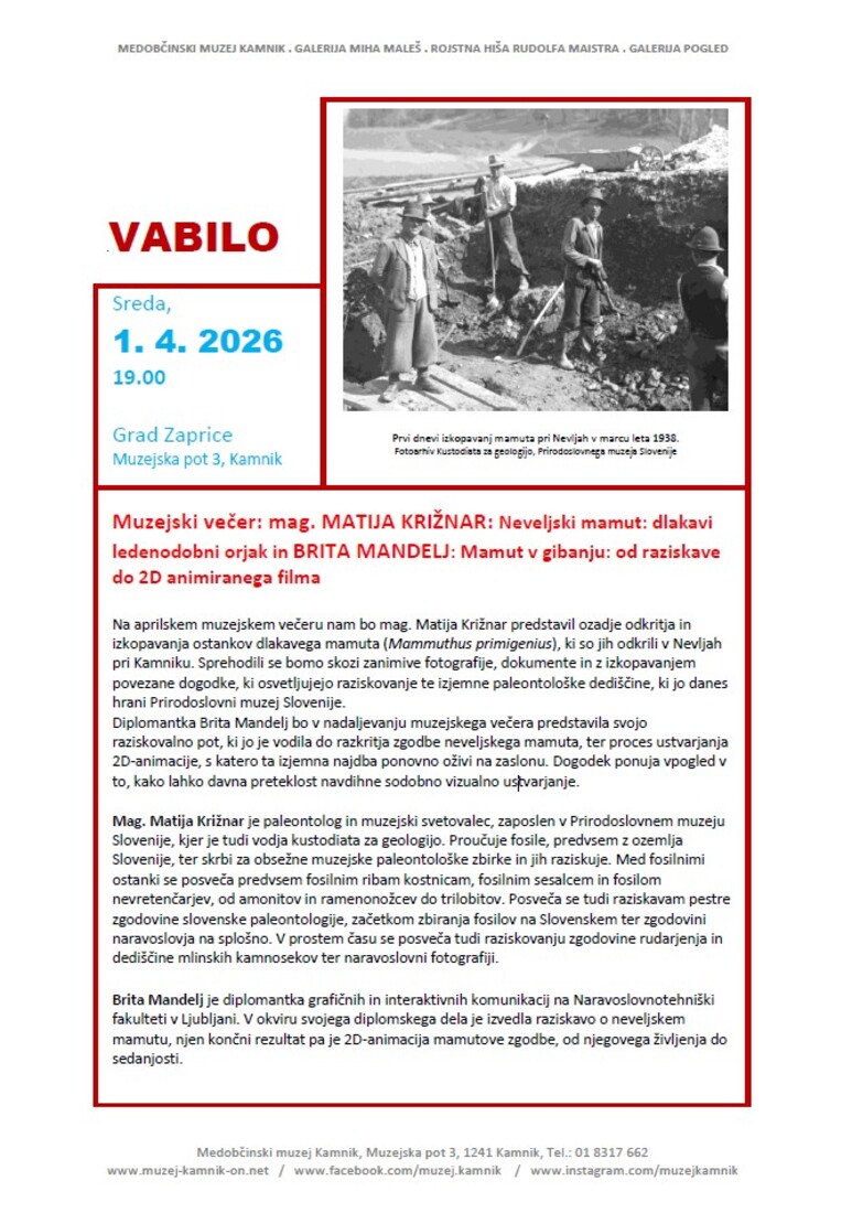 Muzejski večer: mag. Matija Križnar: Neveljski mamut: dlakavi ledenodobni orjak in Brigita Mandelj: Mamut v gibanju: od raziskave do 2D animiranega filma