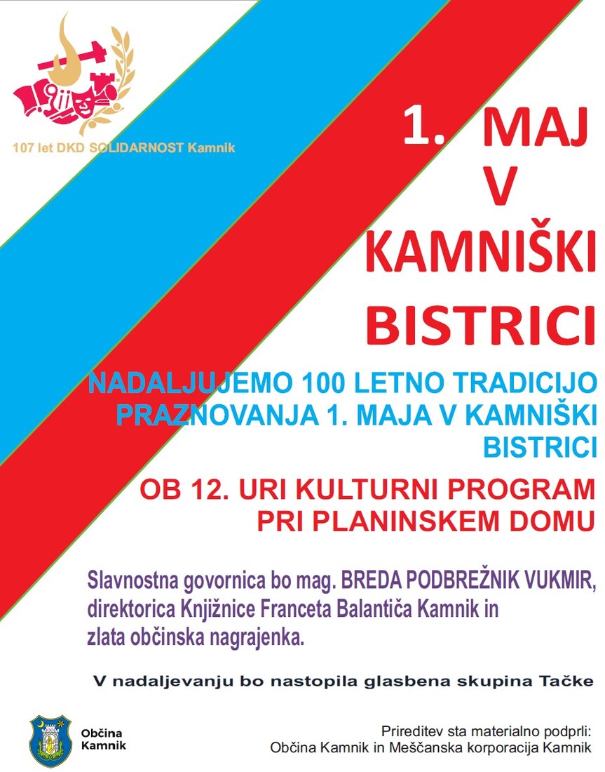 Vabljeni tudi na slovesnost DKD Solidarnost Kamnik ob prazniku dela, ki bo v petek, 1. maja 2026, ob 12. uri pri Planinskem domu v Kamniški Bistrici.