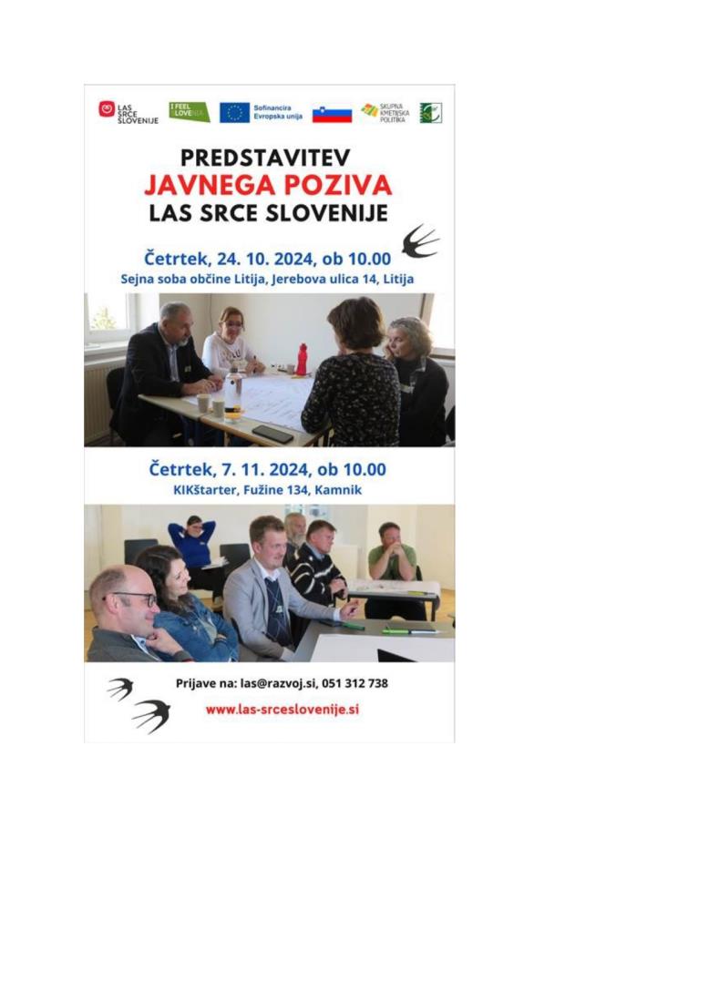 Vabljeni na predstavitev javnega poziva LAS Srce Slovenije, ki bo potekala v Kamniku, 7. 11. 2024 ob 10.00 v prostorih KIKštarterja, Fužine 134, Kamnik. Sledila bo še spletna praktična delavnica vnosa vlog v aplikacijo.
