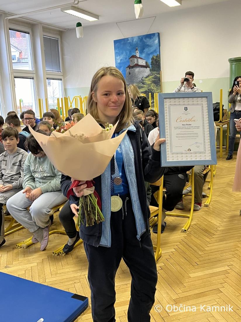 Na 12. Zimskih svetovnih igrah specialne olimpijade v Torinu je kot najhitrejša v smučarskem teku na 50 metrov slavila Nea Štebe, učenka Osnovne šole 27. julija Kamnik.