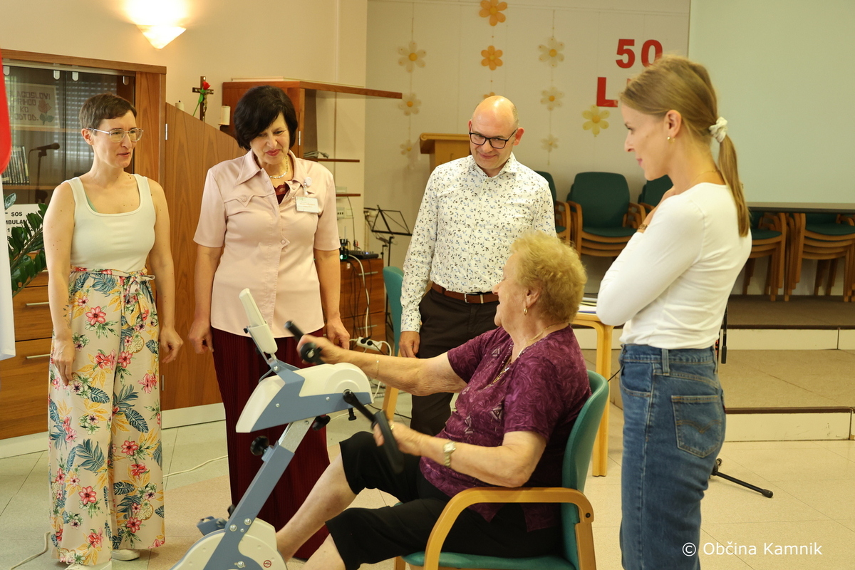 V ponedeljek, 16. junija 2025, je v prostorih Doma starejših občanov Kamnik (v nadaljevanju DSO) potekal dogodek, ki je bil namenjen predaji rehabilitacijskega sobnega kolesa, namenjenega mobilizaciji varovancev DSO, ter predstavitvi primerov dobrih praks dveh evropskih projektov, ki nagovarjata potrebe starejših in ki s svojimi aktivnostmi poskušata zagotoviti kakovostnejše življenje naših občank in občanov.