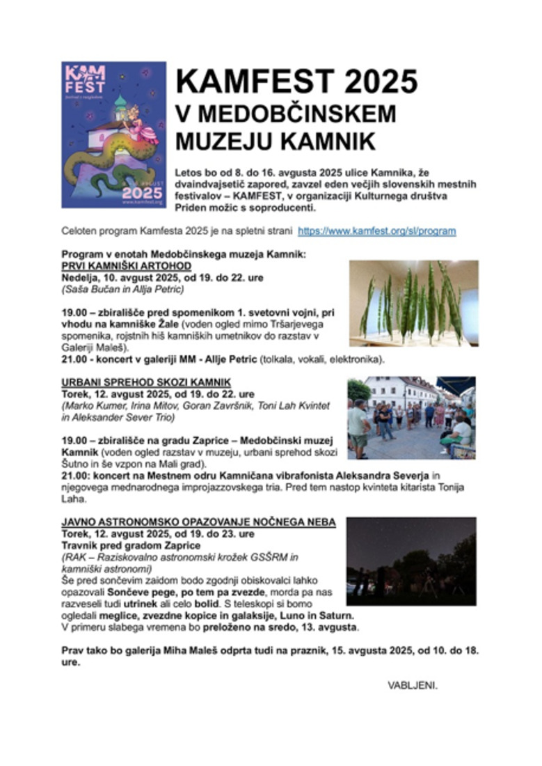 19.00 - zbirališče na gradu Zaprice - Medobčinski muzej Kamnik (voden ogled razstav v muzeju, urbani sprehod skozi Šutno in še vzpon na Mali grad).