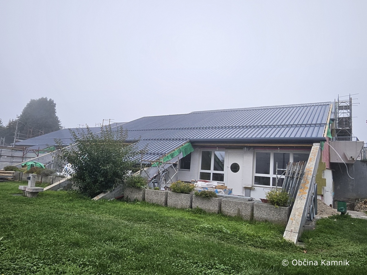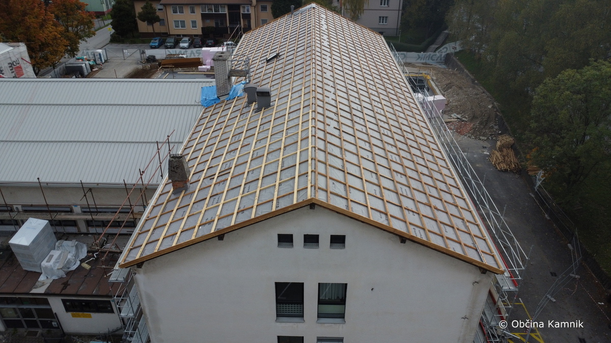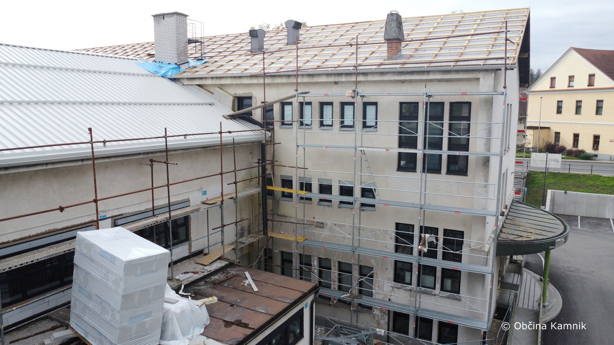 Izvajalec del je v preteklem tednu začel s potrebnimi deli za zamenjavo kritine na delu stavbe št. 1150 v k. o. Kamnik, in sicer na SZ delu objekta, kjer so prostori glasbene šole ter Zavoda za zdravstveno zavarovanje Slovenije.