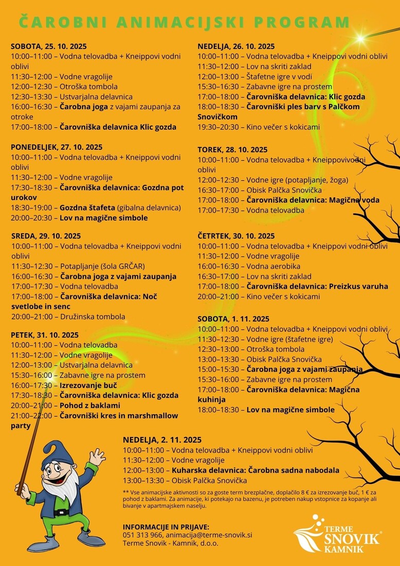 Terme Snovik so že vrsto let znane kot družinam prijazna destinacija, kjer se otroci smejijo, raziskujejo in ustvarjajo, starši pa najdejo mir in ravnovesje. Pester čarobni animacijski program v času krompirjevih počitnic od 25. 10. do 2. 11. 2025 vključuje vodne vragolije, skakanje po vodni preprogi, lov na skriti zaklad, kino večere, plesne in ustvarjalne delavnice z naravnimi materiali, čarovniške delavnice Klic gozda, s katerimi otroci rešijo gozd in postanejo varuhi narave in vode ter še mnogo mnogo več. Vsak dan je nova pustolovščina, ki spodbuja domišljijo, gibanje in skupno preživljanje časa.