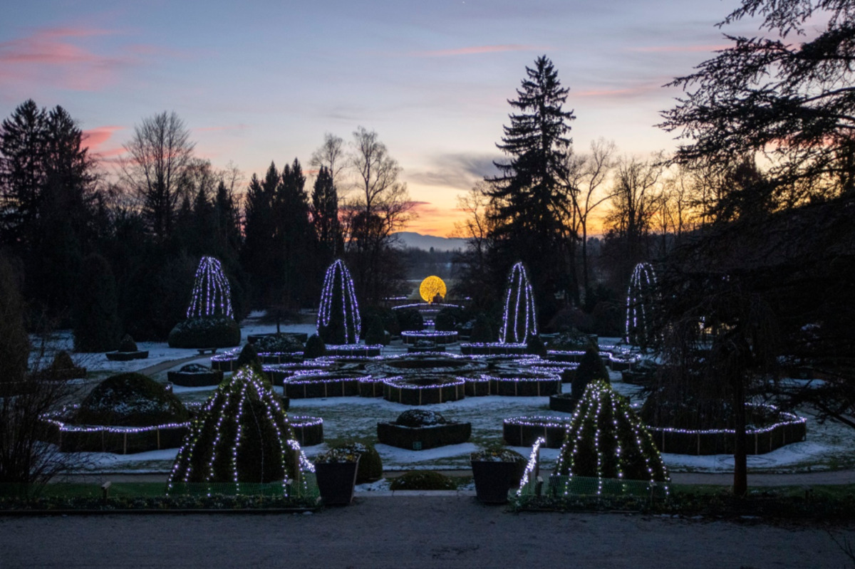 Osvetljena smreka velikanka je postavljena v osi francoskega vrta. Uporabljene pametne lučke omogočajo, da se barve v francoskem vrtu in barve na smreki usklajeno prelivajo. Enak prizor se ponovi na dve minuti.