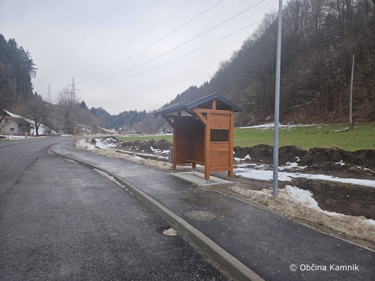 V vasi Bela pri Špitaliču smo ob novem hodniku za pešce uredili ploščadi ter postavili pokrita lesena avtobusna postajališča s pripadajočo opremo.