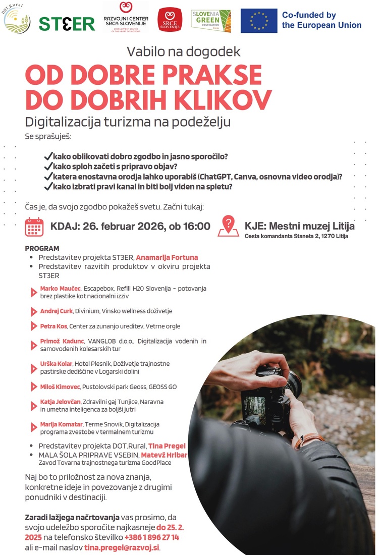Na dogodku boste skozi primere dobrih praks, izmenjavo izkušenj in kratko praktično delavnico dobili konkretne ideje ter uporabne usmeritve, ki jih lahko takoj prenesete v svojo turistično ponudbo.