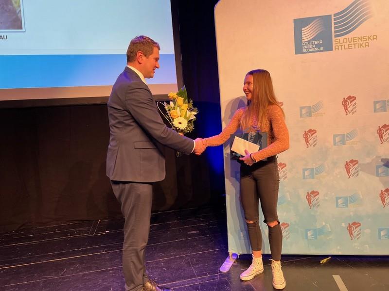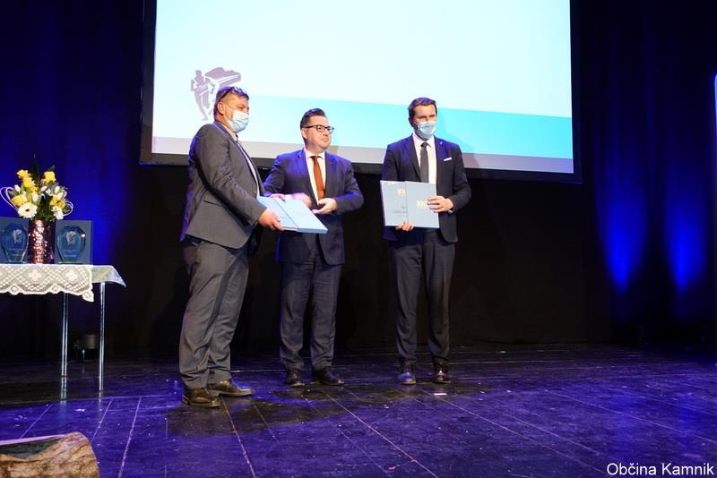 Podeljevalec g. Roman Dobnikar, predsednik AZS, jima je podeli priznanja. Župan, g. Matej Slapar, pa jima je izročil darilni bon in šopek.