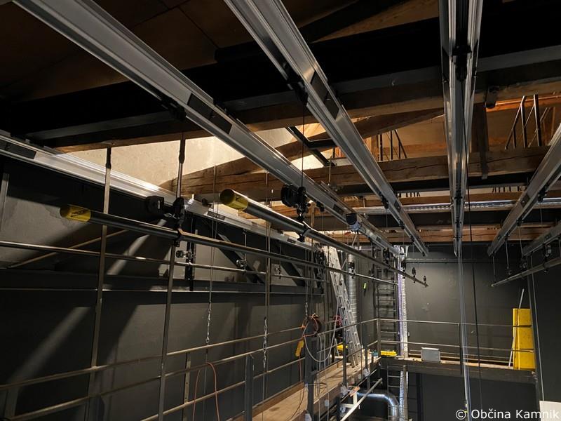 V sklopu projekta zamenjave scenske razsvetljave v Domu kulture Kamnik dela potekajo po načrtih. V preteklem tednu je bil narejen zagon in konfiguracija sedmih scenskih in dveh lučnih vlekov. Trenutno se ureja razsvetljava odrskih galerij ter elektro in komunikacijske instalacije za krmiljenje scenskih luči.