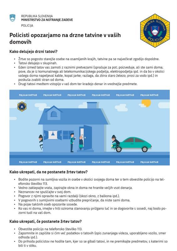 V zadnjem času je na območju Policijske uprave Ljubljana zaznana porast tatvin iz stanovanjskih hiš, kjer so oškodovanci pretežno starejši ljudje. Dejanja izvršujejo predvsem v dopoldanskem času, v odmaknjenih ruralnih območjih, žrtve kaznivih dejanj pa so starejši. Čeprav na območju Policijske postaje Kamnik ni zaznan porast, vseeno občanke in občane opozarjamo na previdnost in samozaščitno ravnanje.