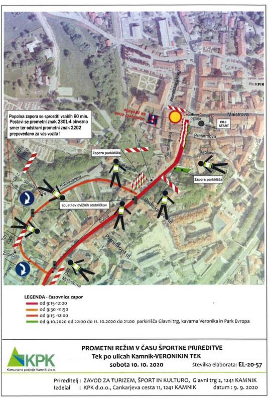 Predlagatelju Zavodu za turizem, šport in kulturo Kamnik, Glavni trg 2, 1241 Kamnik, se dovoljuje zaradi športne prireditve »Tek po ulicah Kamnika – Veronikin tek«, ki bo potekala v soboto, 10. 10. 2020 in nedeljo, 11. 10. 2020, izvesti začasno spremembo prometnega režima – popolno zaporo.