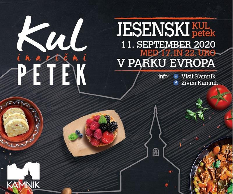 Zavod za turizem, šport in kulturo Kamnik z veseljem sporoča veselo novico, da v petek, 11. septembra 2020, organizira dodatni, jesenski KUL petek, ki bo tokrat obarvan s kamniško dediščino. Nacionalni inštitut za javno zdravje je za dogodek že izdal pozitivno mnenje. Obiskovalci si bodo na Šutenski ulici najprej ogledali razstavo fotografij Slikovni utrinki prazničnega Kamnika v preteklosti, kasneje pa jih bo v parku Evropa v okviru prireditve KUL petek s promenadnim nastopom pozdravila Mestna godba Kamnik z Društvom kamniških mažoretk Veronika, plesno točko bodo imeli plesalci Folklorne skupine Kamnik, zapele pa bodo tudi ljudske pevke Predice. Za živahno pozibavanje na vašem sedežu bo poskrbel ansambel Viharniki.