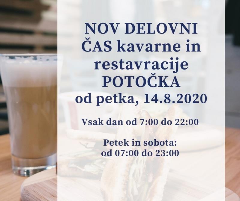 Prav tako se spremeni delovni čas restavracije Potočka. Odpira se ob 7. uri zjutraj, ko že lahko popijete svojo prvo kavo ali čaj. Restavracija je odprta vsak dan do 22. ure, v petek in soboto do 23. ure. Kuhinja dela vsak dan do 21. oz. 22. ure, kasneje, zadnjo uro pred zaprtjem, pa vam z veseljem pripravijo manjši hitri prigrizek.