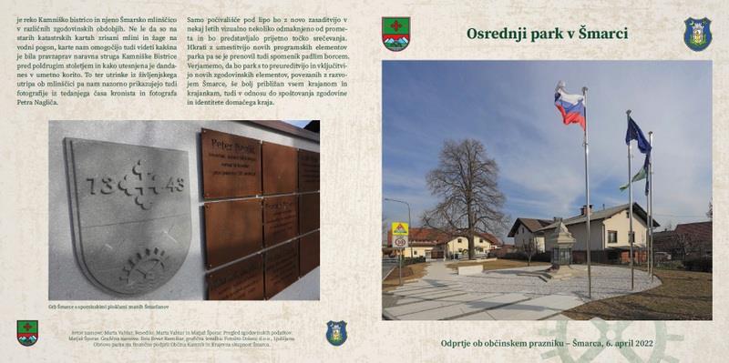 Zbrane je ob tej priložnosti sprva pozdravil predsednik Krajevne skupnosti Šmarca Matjaž Šporar, ki je povedal: »V imenu Krajevne skupnosti Šmarca vas vse lepo pozdravljam in izrekam dobrodošlico. Šmarca, na prvi pogled morda brez posebnih naravnih danosti, pa vendar, ko se malo zazremo okoli sebe zaznamo veliko lepega. Na jugu nam zavetje daje Homški hrib, na zahodu nas obdajajo zelena polja, katerih žitno klasje se poleti obarva zlatorumeno, na severu se oko spočije na prekrasnem kulisju kamniških planin, na vzhodu pa te planine napajajo zeleno os reke Kamniška Bistrica. Že pred nekaj leti so se naši predniki odločili, da del te vode preusmerijo v mlinski kanal skozi Šmarco. Prav tu, v neposredni bližini, se je pretakala ta bistra voda in v naš kraj sprva prinesla življenje, kasneje pa je s svojo energijo gnala vodna kolesa mlinov, žag in fužin, za njimi pa tudi tehnično že bolj sodobne turbine. Vse to pa je omogočalo uspešen razvoj kraja, predvsem obrti in podjetništva. Vse te zgodovinske elemente smo vključili v samo prenovo parka, saj smo želeli izkazati spoštovanje našim prednikom in pokazati čut do naravne dediščine. Okoli mogočne vaške lipe, ki se ponosno dviga tu nad parkom, je postavljena klop, ki je v obliki mlinskega kolesa in je namenjena za sedenje ter počivanje. Opremljena je tudi z diskretno osvetlitvijo. Tlakovana pot skozi park pa simbolizira tok vode in je sestavljena iz monumentalnih plošč različnih dimenzij. Ob poti se dvigata dva manjša zidca, ki imata na svojih stranicah odtisnjena reliefa družinskih imen lastnikov nekdanjih vodnih naprav. Spominski zid, tu za menoj, pa smo obeležili z informativno izobraževalno tablo, opremljeno s kratko zgodovino Šmarce in šmarske mlinščice s prikazom arhivskih katastrov z dodanimi lokacijami vodnih naprav. Dodatno pa smo vključili fotografije tedanjega časa fotografa Petra Nagliča. Dodan je tudi najnovejši ortofoto posnetek, ki predstavlja Šmarco z vrisanim potekom mlinščice. Nasprotna stran pa je posvečena spominu na nekdanje krajane, ki so se zapisali v zgodovino kraja ali širše, poleg pa je dodan še reliefni opis našega grba. V ta grb smo vključili vse glavne krajevne atribute. Na več mestih parka je dodana nova zasaditev, ki pa mora omogočati preglednost križišča. Verjamemo, da bo park s to preureditvijo še bolj približan vsem krajanom tudi v odnosu do spoštovanja zgodovine in identitete domačega kraja. Ker pa si vsako dobro opravljeno delo zasluži tudi zahvalo, bi se ob koncu zahvalil Občini Kamnik, županu Mateju Slaparju in podžupanu Bogdanu Pogačarju, za izdatno finančno pomoč, ostalim pristojnim službam pa za skrb, da je projekt nemoteno potekal in se uspešno zaključil. Zahvala gre vsem izvajalcem del, še posebno podjetju Žurbi, ki je opravilo glavnino del v roku in kvalitetno, ravno tako Komunalnemu podjetju Kamnik, d. o. o., ki je opravilo prvo fazo prenove parka, podjetju Vrton za izvedbo nove zasaditve, podjetju Emeršič za obrtniška dela, posebna zahvala gre krajinski arhitekti Marti Vahtar, ki je prisluhnila našim željam in zasnovala izvirno rešitev celotnega parka. Hvala tudi občinskemu svetniku Marku Šarcu, ki je za realizacijo projekta namenil veliko svojega prostega časa. Hvala lepa Kulturnemu društvu Šmarca za organizacijo današnjega kulturnega programa, članom krajevne skupnosti in gasilcem PGD Šmarca in Kaji za čudovit cvetlični aranžma.«