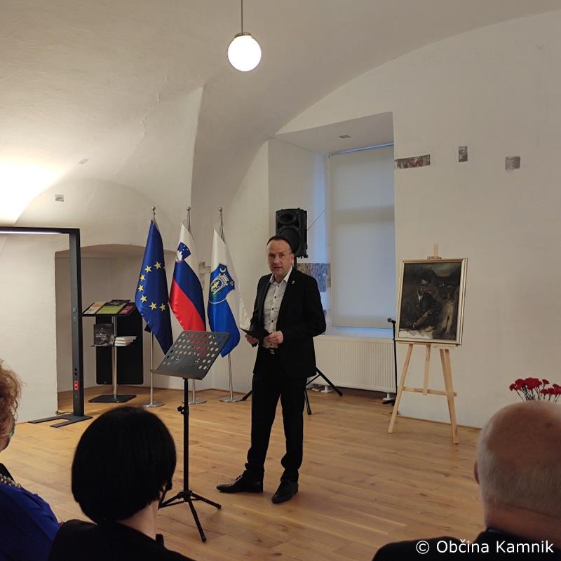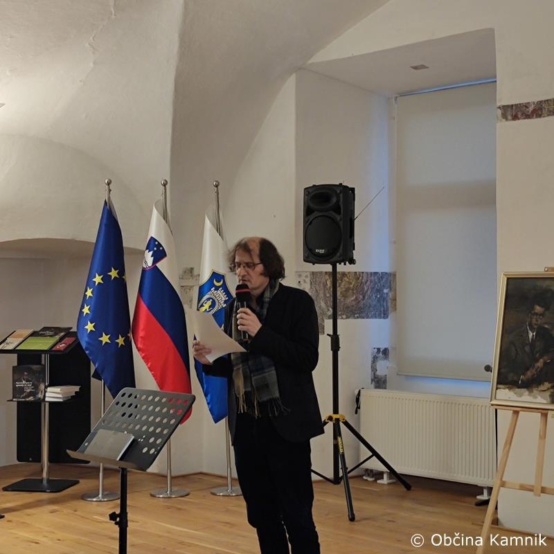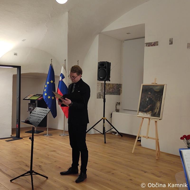 »V imenu župana Mateja Slaparja, Občine Kamnik in v mojem lastnem imenu vam želim prisrčno dobrodošlico v samostanu Mekinje. Hvala organizatorjem dogodka Knjižnici Franceta Balantiča Kamnik in Društvu Slovenskih pisateljev, ki sta z organizacijo današnjega večera počastila spomin na življenje in delo našega rojaka ter kamničana pesnika Franceta Balantiča. 29. novembra 2021 je minilo 100 let od rojstva našega pesnika. Čeprav je njegovo srce prenehalo biti mnogo prekmalu bo preko njegove pesniške zapuščine vedno živel spomin nanj. On je eden velikih pesnikov prejšnjega stoletja in slovenski sonetist. Vsaka črka izlita na papir je odsev trpeče pesniške duše, vsaka beseda v njegovih sonetih senca predanosti usodi. Kamnik pesniku namenja svoj prostor pod soncem. Na Novem trgu, kjer je pesnik preživljal mladost, nanj spominja spomenik. Njegovo ime ponosno nosi tudi kamniška knjižnica, pesnika pa se spominjamo tudi ob dogodkih kot je današnji.Danes se bomo njegovemu življenju in delu poklonili s poslušanjem njegovih pesni in ogledom razstave likovnih del, ki so nastale na temo Balantičevih pesmi. Zahvaljujem se vsem, ki ste počastili spomin nanj s svojo prisotnostjo in vam želim prijeten večer in ponesite delček Balantiča v svoje domove.«