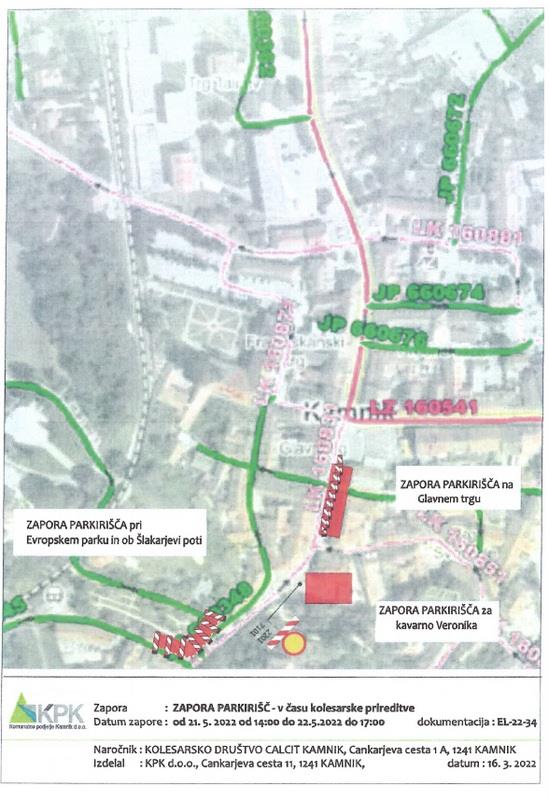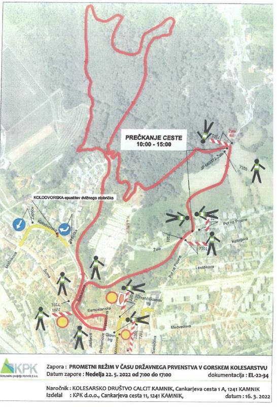Občanke in očane obveščamo, da bo organizator KD Calcit, Cankarjeva cesta 3, 1240 Kamnik, izvedel športno prireditev »mednarodno kolesarsko dirko – gorsko kolesarstvo« in bo zaradi tega v nedeljo, 22. maja 2022, veljala začasna sprememba prometnega režima.