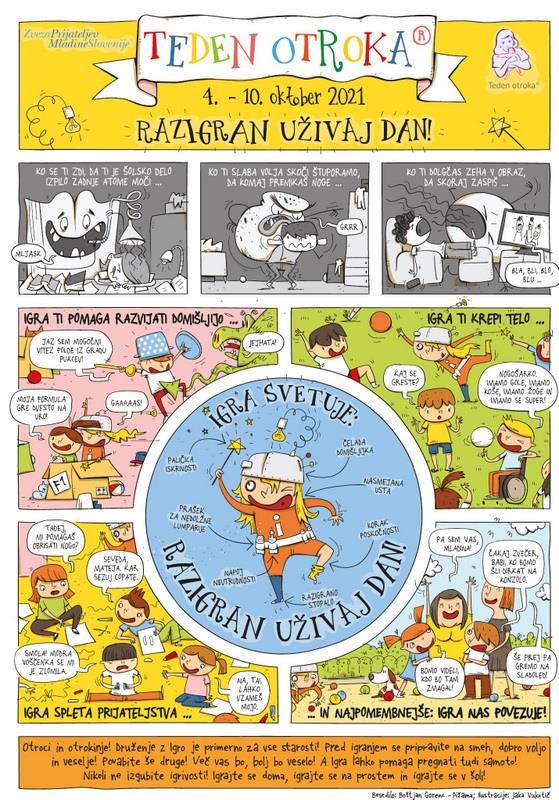 Z današnjim dnem se pričenja Teden otroka, ki se letos odvija od 4. do 10. oktobrom, in v ospredje postavlja osrednjo temo »Razigran uživaj dan!«. Kot protiutež epidemiji, šolanju od doma in posledicam, ki iz tega izhajajo, želijo organizatorji Tedna otroka, Zveze prijateljev mladine Slovenije, poudariti pomen igre in igranja. Igra in igranje prinašata veselje in sproščenost, burita našo domišljijo, nas povezujeta, navdihujeta. Tudi odrasli ne bi smeli pozabiti na igrivost, saj je to eden najmočnejših osebnih virov moči, ki nam lahko izjemno pomaga v času strahu in pritiskov.