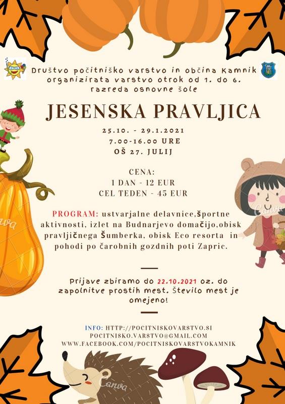 Program Jesenska pravljica je zastavljen z veliko aktivnostmi in vsebuje tudi izlete na Budnarjevo domačijo (kostanjev piknik in iskanje skritega zaklada), obisk Pravljičnega Šumberka, obisk Eco resorta (spoznavanje in hranjenje živali) in pohod po čarobnih gozdnih poti Zapric. Ekipa društva Počitniško varstvo Kamnik se bo potrudila, da otrokom pričara sproščeno počitniško vzdušje.