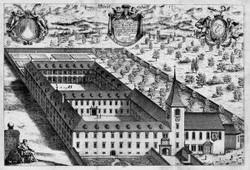 Samostan v Mekinjah po obnovi med letoma 1682–1686 (J. W. Valvasor, Die Ehre deß Herzogthums Crain, Buch IX., Nürenberg 1689)