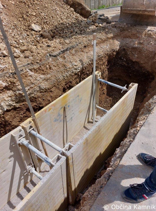 Izvajalec bo nadaljeval z vgradnjo temeljev za postavitev nosilcev lovilne mreže in pričel z izkopom in vgradnjo drenažnih reber, ki jih bo povezal na zgrajen sistem vezne kanalizacije. Dela potekajo po predvidenem terminskem načrtu.