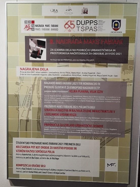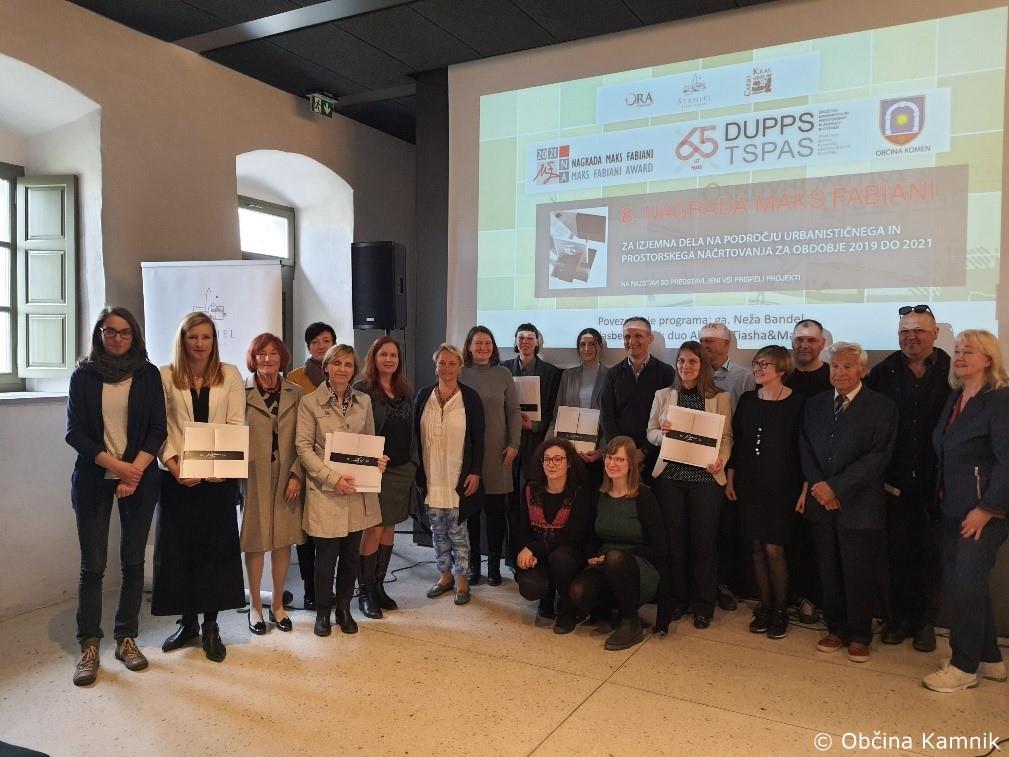 V soboto, 23. aprila je v Viteški dvorani Gradu Štanjel potekala podelitev osme 𝙉𝙖𝙜𝙧𝙖𝙙𝙚 𝙈𝙖𝙠𝙨 𝙁𝙖𝙗𝙞𝙖𝙣𝙞 2021 𝙞𝙣 𝙤𝙩𝙫𝙤𝙧𝙞𝙩𝙚𝙫 𝙧𝙖𝙯𝙨𝙩𝙖𝙫𝙚 nagrajenih del. Nagrado, za izjemna dela na področju urbanističnega in prostorskega načrtovanja, je podelilo Društvo urbanistov in prostorskih planerjev Slovenije, Ustanova Maks Fabiani in Občina Komen, v sodelovanju z Ministrstvom za kulturo ter Ministrstvom za okolje in prostor.
