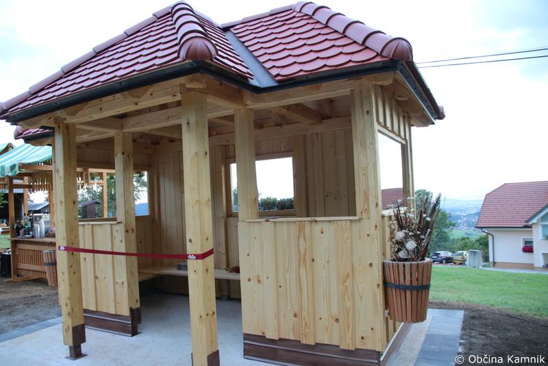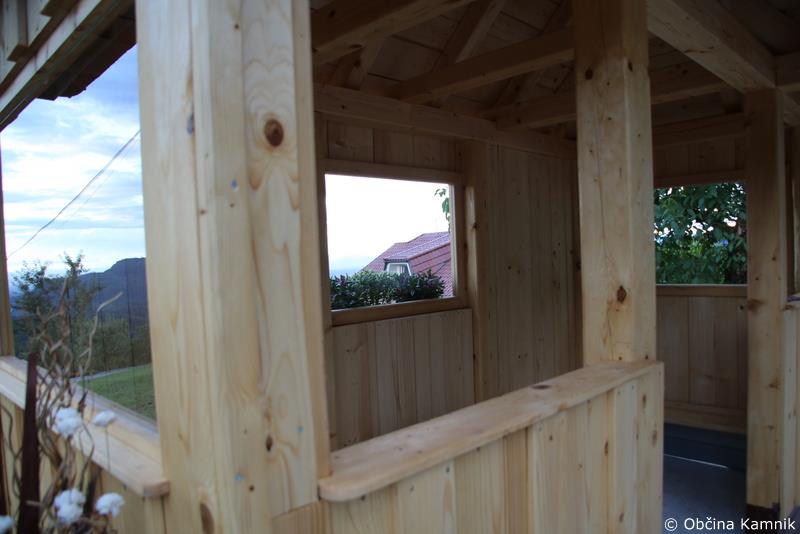 Zdravko Potočnik vpel stekla. Z Bojanom sta v Janezovi delavnici pooblala deske za stene, iz suhega lesa pa je Janez napravil še klopce. Te je bilo potrebno opasati v hišico na železne konzole, za katere je poskrbel Bojan - mojster varjenja.