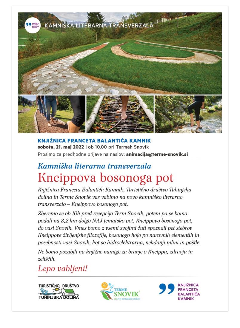 V Snoviku bo v soboto, 21. maja 2022, potekala nova kamniška literarna transverzala. Na pobudo Knjižnice Franceta Balantiča Kamnik so s Termami Snovik in Turističnim društvom Tuhinjska dolina ustvarili odlično zasnovo za novo transverzalo po Kneippovi bosonogi poti. Dogodek se prične ob 10. uri pred Termami Snovik, potem pa se boste podali na 3,2 km dolgo NAJ tematsko pot, Kneippovo bosonogo pot do vasi Snovik. Vmes boste spoznali pet stebrov Kneippove življenjske filozofije z vsemi svojimi čuti, bosonogo hojo po naravnih elementih in posebnosti vasi Snovik, kot so hidroelektrarna, nekdanji mlini v vasi in paštle. Razgibano pot bodo popestrili še s knjižnimi namigi za branje o Kneippu, zdravju in zeliščih.