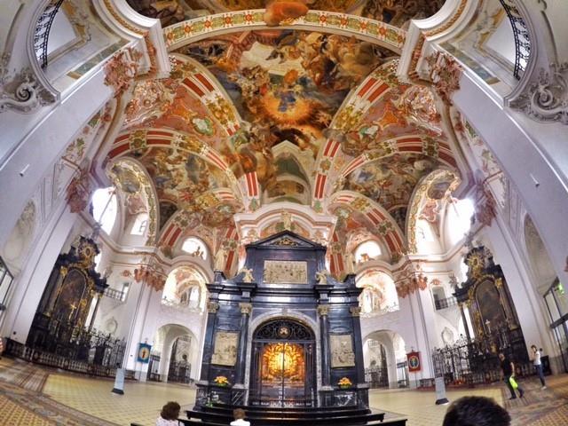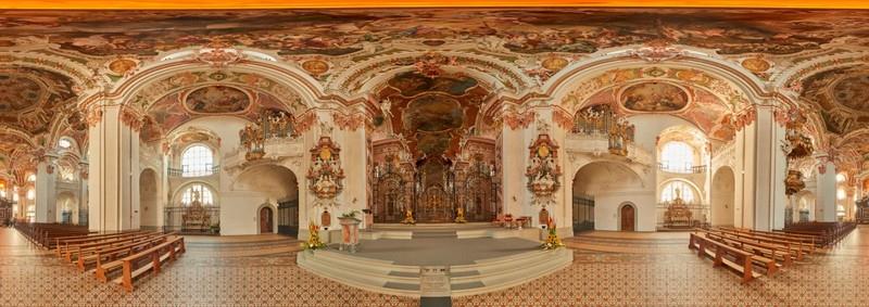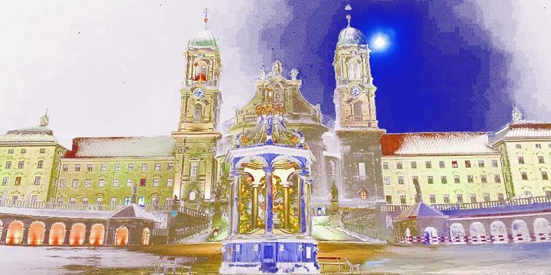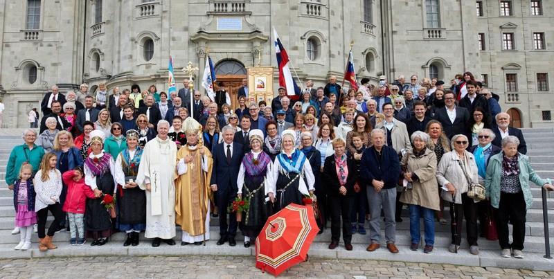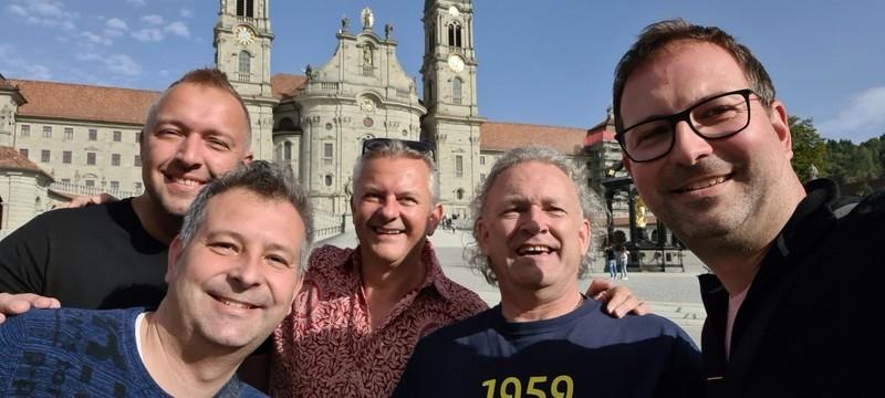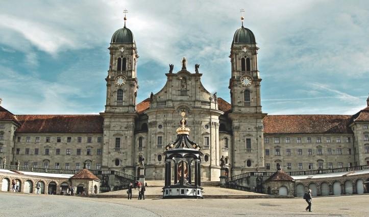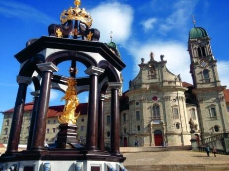 V jasnem dnevu, brez gneče na cestah, smo že ob opoldanskem zvonenju prispeli v to enkratno švicarsko romarsko »meko« in začudeni obstali pred najpomembnejšo baročno zgradbo v Švici s kapelo Božjega usmiljenja in likom Črne Madone, ki je med vsemi katoličani zelo cenjena. Samostan in baziliko so ustanovili benediktinski opati v 10. stoletju in tega smo bili zelo veseli, saj je zavetnik naše domače župnije prav sv. Benedikt. Sam samostan pa je počivališče na priljubljeni peš poti svetega Jakoba.