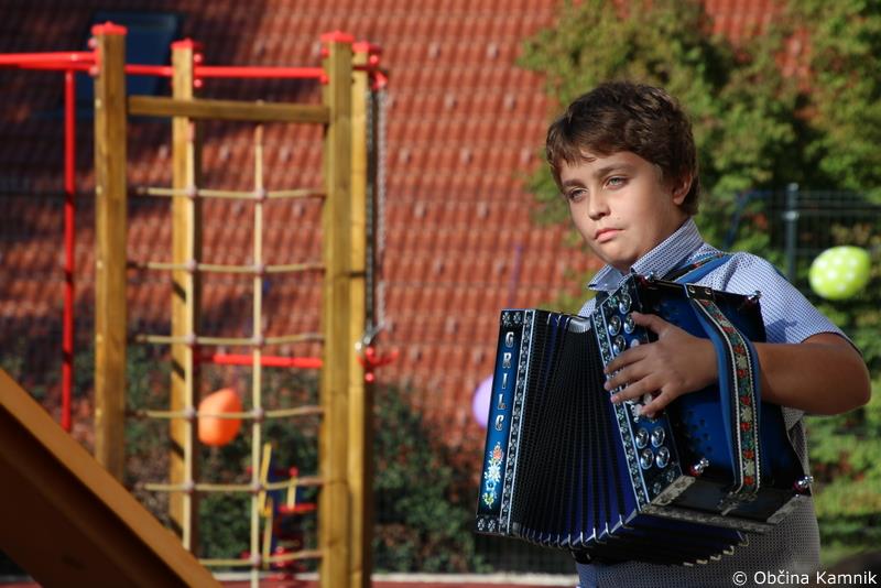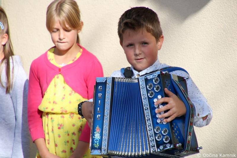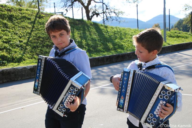 učenci Podružnične šole Zgornji Tuhinj. Harmonikarja