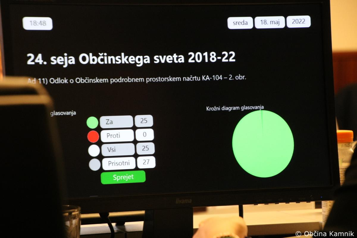 Danes, 18. maja 2022, je v Sejni dvorani Občine Kamnik potekala 24. redna seja Občinskega sveta Občine Kamnik, na kateri so svetnice in svetniki med drugim potrdili Odlok o spremembah in dopolnitvah Odloka o gospodarskih javnih službah v Občini Kamnik, sprejeli Strategijo za mlade v občini Kamnik 2022–2026 in več prostorskih aktov. V prvi obravnavi so svetnice in svetniki sprejeli Odlok o koncesiji za opravljanje lokalne gospodarske javne službe dobave, postavitve, vzdrževanja in izvajanja javne razsvetljave in svetlobne prometne signalizacije v Občini Kamnik.