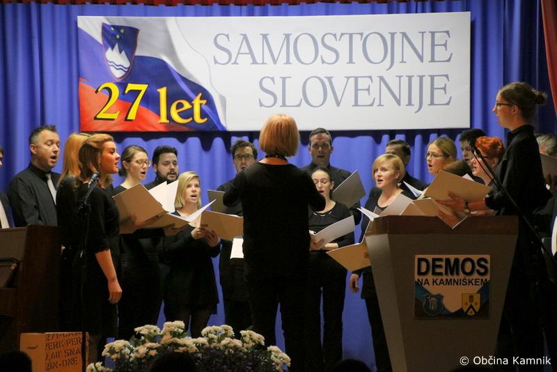 Slavnostni govornik, župan Matej Slapar pa je zbranim čestital ob preteklem prazniku, namenil lepe misli za leto, ki prihaja, v svojem govoru pa poudaril pomen enotnosti: »Dan samostojnosti in enotnosti je državni praznik, ki obeležuje spomin na plebiscitarno odločitev 23. decembra 1990 in njeno razglasitev 26. decembra istega leta. Odločitev se je nedvomno zapisala globoko in neizbrisno v zgodovinski spomin vseh prebivalk in prebivalcev naše domovine, ki so in ste s svojo odločitvijo dokončno vsi skupaj sledili cilju ter hrepenenju mnogih generacij pred nami in vami. Hrepenenju po tem, da gremo skupaj po svoji samostojni poti naprej. To ni samo praznik samostojnosti. Je praznik enotnosti, saj smo skupaj uspeli preseči vse ideološke in druge razlike, ki so nas do takrat delile. V najtežjih in prelomnih trenutkih smo pozabili na zgodovinske zamere iz preteklosti in izbrali skupno pot, ki se je v zgodovini že na nek način nakazovala, pa nam do takrat, zaradi različnih razlogov in okoliščin, ni uspelo. Takrat, leta 1990, pa nam je. Uspelo nam je izstopiti iz tedanje skupne države, v kateri se je kmalu zgodilo nasilje nepredstavljivih razsežnosti. Takrat je slovenski narod izrazil izjemno enotnost. Enotnost po skupni državi, po slovenski zastavi, slovenski himni, po sodelovanju in tistemu najpomembnejšemu, po samostojni in neodvisni Republiki Sloveniji. Takrat smo postavili temeljni kamen naše nove, slovenske države. Kako zelo smo bili enotni. Pa premoremo takšno enotnost tudi danes? Smo nanjo res lahko tako hitro pozabili in se brez kančka sočutja do lastne države obnašamo tako brezbrižno? Spoštovane občanke in občani, želim, da nam bi bil imperativ in želja po takšni enotnosti, kakršne smo bili priče takrat leta 1990, vodilo za razvoj, za sožitje in blaginjo za danes ter v prihodnje. Prihodnost, ki jo ustvarjamo in ki jo bodo bolj kot mi doživljali tisti, katerih čas šele prihaja, ne more biti samoumevna posledica naključnih dogodkov. Prihodnost mora biti osmišljen projekt razvoja našega naroda, pod okriljem najbolj plemenitih izkustev in znanj sodobnega sveta. Prihodnost je lahko le posledica strpnega dialoga, povezovanja, solidarnosti in iskrenosti. Zato si želim, da bi prihodnost načrtovali skupaj.«