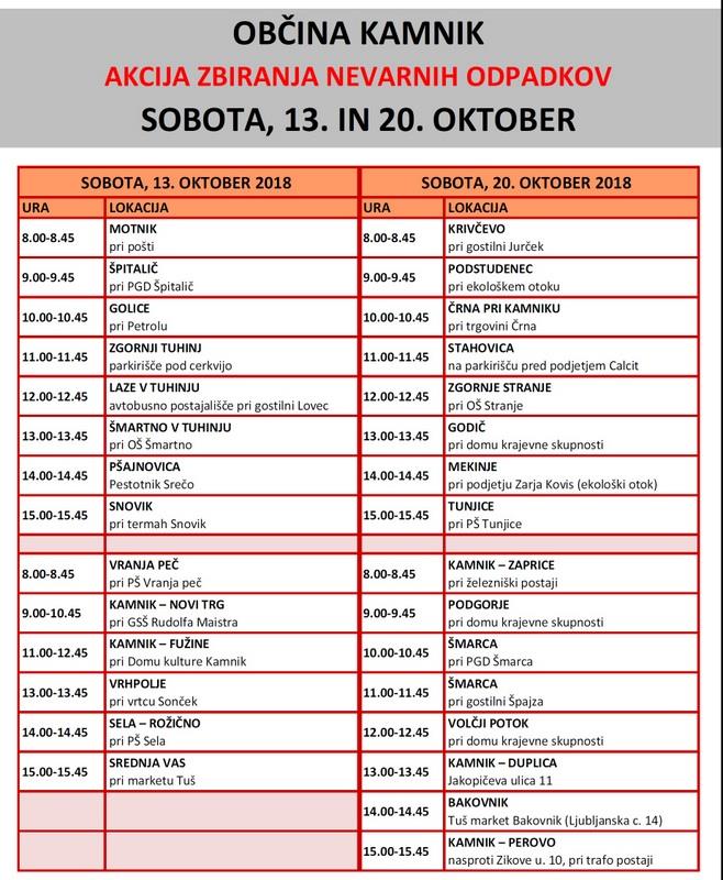 V soboto, 13. in 14. oktobra 2018, bo potekala jesenska akcija zbiranja nevarnih odpadkov iz gospodinjstev na območju občine Kamnik. Akcija bo izvedena s tovornim vozilom opremljenim z ustreznimi posodami za zbiranje posameznih vrst nevarnih odpadkov. Tovrstne odpadke boste lahko oddali usposobljeni ekipi, ki vas bo pričakovala na lokacijah spodaj.