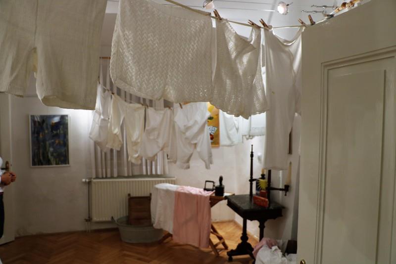 Razstava Spodi n'č, gor pa b'l mau prikazuje spodnje perilo naših babic in dedkov. Zgodovina nošenja perila je kratka in je bila v svojih začetkih ovita v tančico skrivnosti. Spodnje perilo je veljalo za oblačilni kos, ki mora biti skrit očem in navidezno nepomemben. Oprano perilo so sušili večinoma v skritih kotičkih, da tega nihče ni videl. Etnologi takšno ravnanje pripisujejo dejstvu, da je spodnje perilo veljalo za bolj erotično kot golota.
