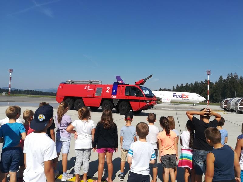Nato smo skozi terminal stopili na glavno ploščad in se vkrcali na letališki avtobus, ki nas je popeljal po celotnem kompleksu letališča. Videli smo helikoptersko bazo, prostor za razvščanje prtljage, tehniko za popravilo letal in pisto. Z avtobusa smo opazovali letala pri vzletu in občudovali prilagojena vozila za servisiranje letal. Ugotovili smo, da letala skrivajo svoj velik rezervoar goriva v svojih krilih. Obiskali so nas tudi letališki gasilci, ki imajo ogromna vozila, primerna za gašenje požarov. Pri vžigu letala morajo gasiti le s peno.