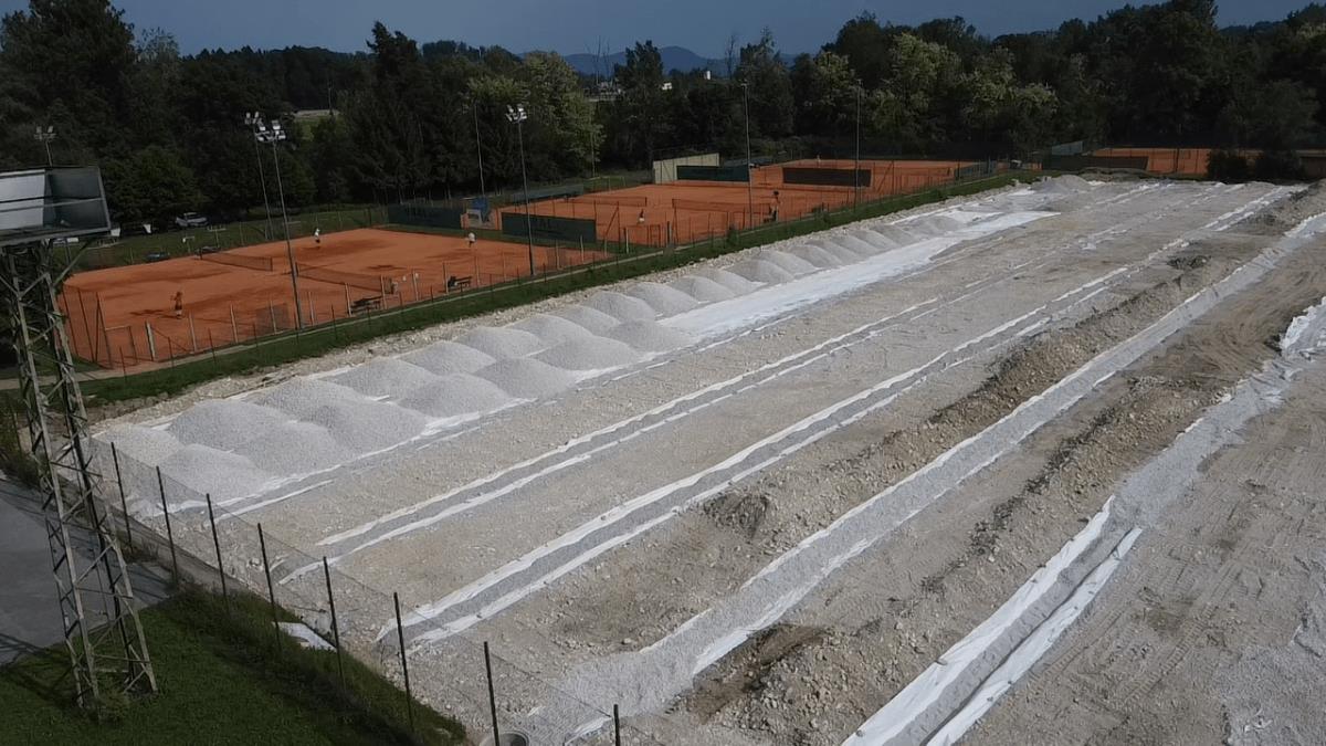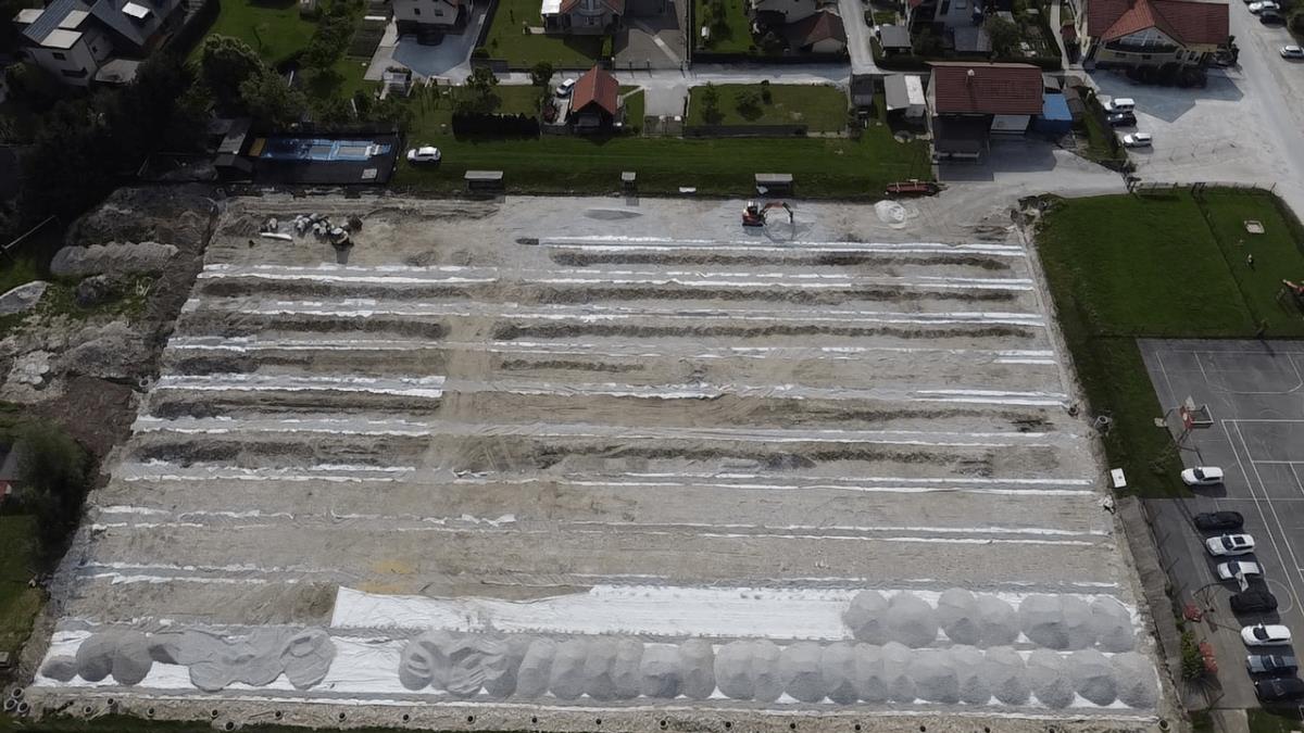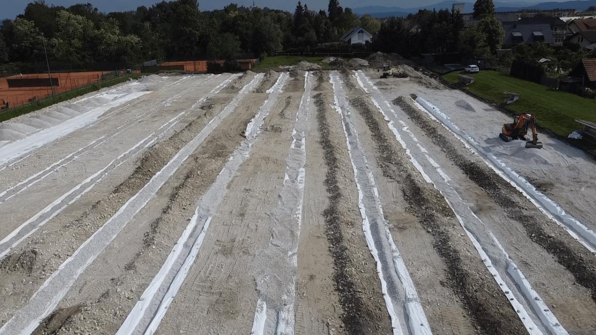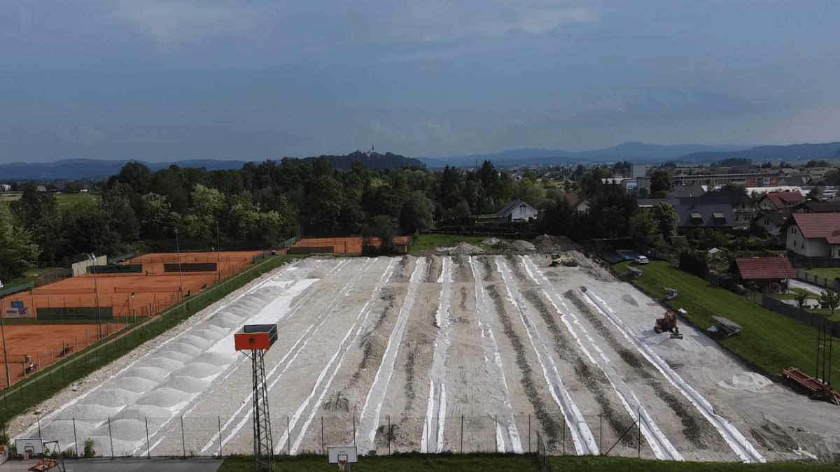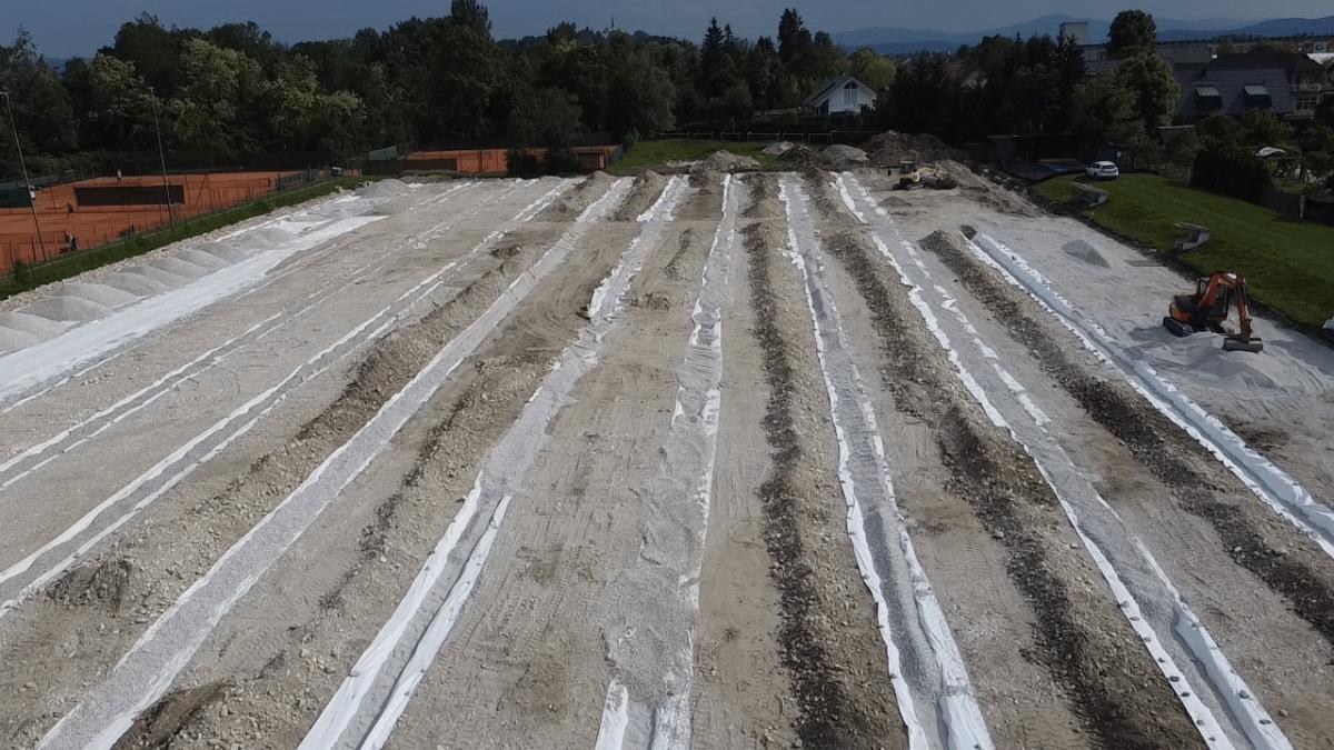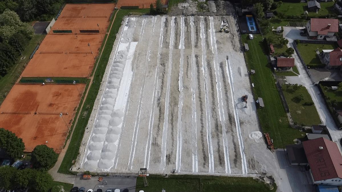 V 20. tednu je izvajalec del nadaljeval z izkopom jarkov za položitev ter obsutje drenažne cevi za namen izgradnje 5 drenažnih reber v skupni dolžini 540 metrov. Vsako od reber je na severni in južni strani priključeno na sistem vezne kanalizacije, ki je na jugu povezana v sistem 4 ponikovalnic. Na celotni južni ter 30 metrov na zahodni strani igrišča je izvajalec del zgradil vezno kanalizacijo za odvajanje padavinskih voda v ponikovalnico. V tem tednu se načrtuje dokončanje vezne kanalizacije in drenaže ter izgradnja opornega zidu na severni strani igrišča.