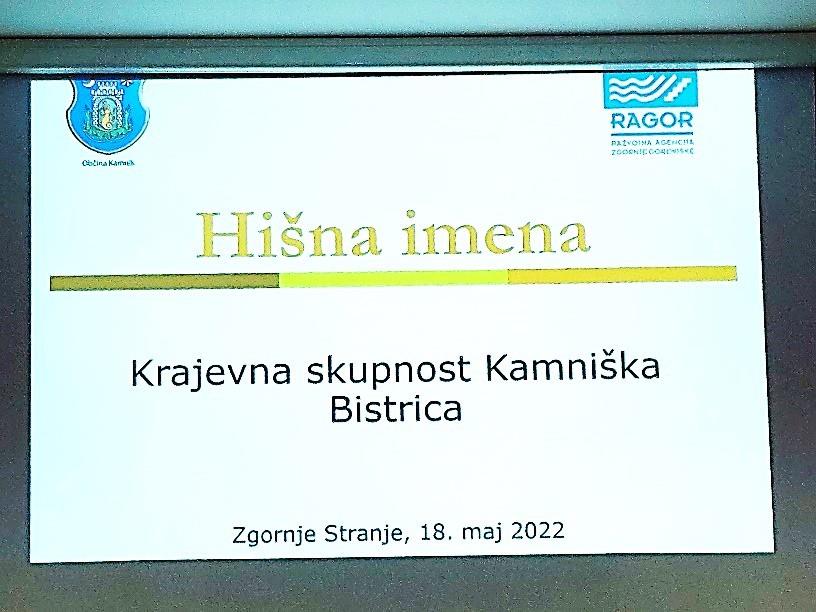 V sredo 18. maja 2022 je v gasilskem domu v Zgornjih Stranjah potekalo srečanje z domačini na temo starih hišnih imen. Veronika Perko in Klemen Klinar iz Razvojen agencije Zgornje Gorenjske sta na kratko predstavila projekt in rezultate zbiranja starih hišnih imen v krajevni skupnosti Kamniška Bistrica.