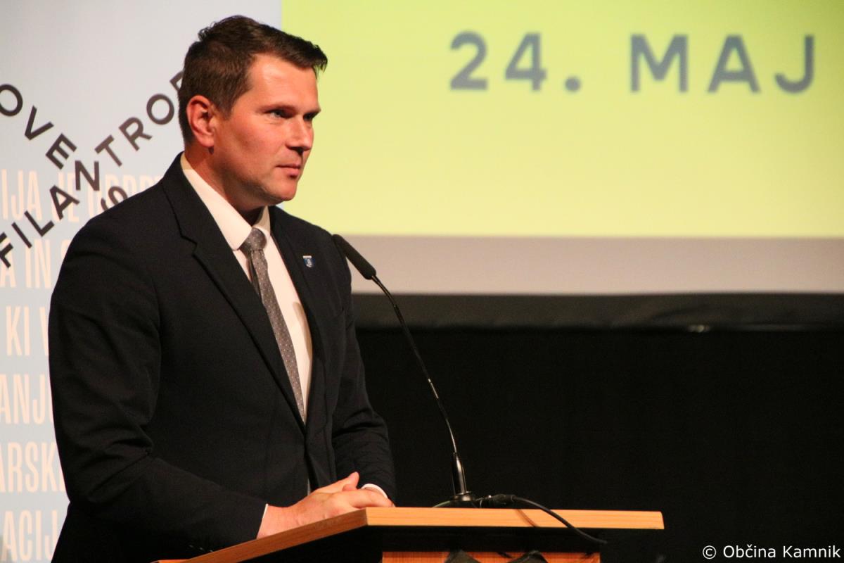 Župan Matej Slapar pa je ob tej priložnosti pozdravil navzoče in opomnil na to, da smo pred dnevi izgubili enega najvidnejših slovenskih prostovoljcev dr. Aleksandra Dopliharja, v znak spoštovanja pa smo se mu poklonili z minuto molka: »Dobrodošli v Kamniku, ki je bogata v smislu kulturne dediščine, naravnih danosti in bogata ljudi, ki prostovoljstvo nosijo v srcu. Danes smo tukaj zaradi plemenite dejavnosti, ki ne izpopolnjuje le tiste, ki pomoč potrebujejo, ampak tiste, ki jo dajete. Hvaležen sem vsem vam ter vam iskreno čestitam v imenu Občine Kamnik, saj prejeto priznanje pomeni priznanje predanemu delu, ko v prostem času dvigate kvaliteto življenja mnogim, kar pa ni vidno le v lokalni skupnosti, temveč tudi na nacionalnem nivoju. Veseli me, da smo danes gostitelji in s tem kažemo, da je tudi v Kamniku prostovoljstvo na visokem nivoju. Naj se ob tej priložnosti še posebej zahvalim našim, kamniškim prostovoljkam in prostovoljcem, ki delujejo kot gasilci v prostovoljnih gasilskih društev, v kulturnih in športnih društvih, pa tistih, ki delujejo okviru dnevnega centra, namenjenega osebam s težavami v duševnem zdravju, Dnevnemu centru Štacjon in centra, in dnevnega centra mlajšim invalidnim osebam, ki ga strokovno vodi Društvo staršev otrok s posebnimi potrebami. Izpostavil bi predvsem Zavod Oreli, s katerim Občina Kamnik že nekaj let uspešno sodeluje. Naj to priložnost izkoristim tudi za to, da se z minuto molka poklonimo našem častnemu občanu in visoko spoštovanemu prostovoljcu dr. Aleksandru Dopliharju, ki smo ga pred nekaj dnevi izgubili. Dr. Doplihar je bil najbolj pomemben med prostovoljci, saj je ustanovil Pro bono ordinacijo, ki pomaga sočloveku na področju zdravstva.«