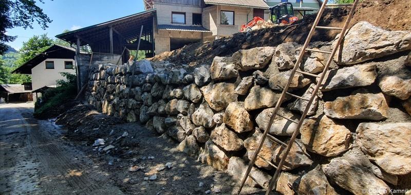 Nad občinsko cesto Laze – Vrhač se je obstoječ betonski zid nevarno nagibal proticesti. Lastnik zemljišča je nevaren zid odstranil in začel z gradnjo novega zidu iz kamna v betonu, ki bo zagotovil ustrezno varnost.