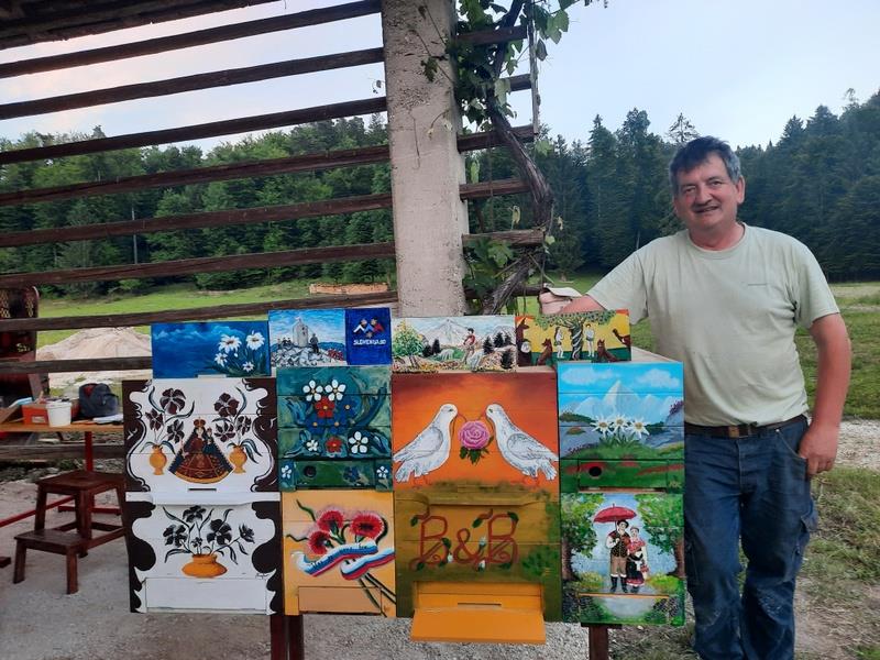 Na povabilo čebelarja Sebastjana Romšaka smo članice Likovnega društva Mengeš na »Ožbovčevi domačiji« na Podjelšah v Mekinjah zadnji ponedeljek v maju pričele s slikanjem na panje. Pri slikanju čebelarskih, poučnih, živalskih, verskih in slovenskih motivov ter motivov povzetih iz vsakdanjega življenja podeželskega prebivalstva na čisto nove panje narejene iz smrekovega lesa nas je vseskozi "gostila" celotna družina.
