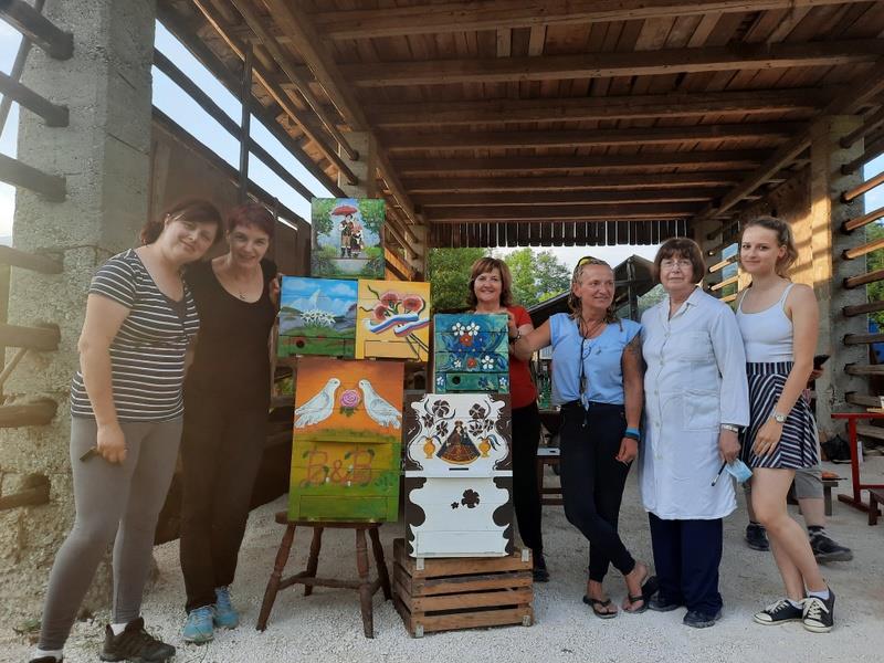 V preteklosti so za poslikavo uporabljali oljne barve zemeljskih tonov, tem pa so primešali tudi domače laneno olje. Doma pridobljene barve so omogočale dolgotrajno obstojnost poslikav in bile odporne proti različnim vremenskim razmeram. Me smo uporabile barve, ki so namenjene za poslikavo panjskih končnic in so nas ob prihodu na domačijo že čakale. Prijetno vzdušje z veliko smeha se je na domačiji nadaljevalo tudi teden kasneje, ko se je nam pridružilo pri ustvarjanju še nekaj članic.