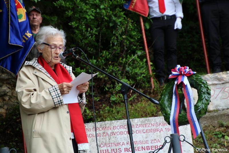 Slavnostna govornica Valeriji Skrinjar Tvrz pa je nato v nadaljevanju zbranim namenila naslednje misli: »Spoštovani, nahajamo se pred obeležjem spomina, spoštovanja in hvaležnosti partizanskim borcem za svobodo naše domovine. Ko rečem partizanskim borcem mislim tudi na vse tovariše iz Amerike in Anglije, ki so se skupaj z nami borili proti nacifašistom in tukaj našli svoj poslednji dom. Zato vas vse pozdravljam s partizanskim pozdravom: »Smrt fašizmu!«. Minilo je polnih 80 let, odkar smo prebivalci Kraljevine Jugoslavije doživeli sramotno kapitulacijo takratne vlade, ki je gledala le svojo korist, a narode, ljudi pahnila v zločinski nemški, italijanski in madžarski nacionalistični okupatorski vojski. In kdo je takrat v Sloveniji mislil na soljudi? Najpogumnejši, ki so spoštovali dostojanstvo človeka in njegove pravice ter svobodo domovine. Ti so se 27. aprila 1941 zbrali na tajnem sestanku in ustanovili Osvobodilno fronto, ki je pripeljala ljudi v vsesplošni ljudski upor. Ustanovljene so bile partizanske čete, ki so prerasle v odrede, bataljone, brigade, divizije in korpuse. Ti so se borili proti okupatorju, ga preganjali in uničevali. A ljudem, v vaseh in mestih, prinašali svobodo in jim vračali domačo, slovensko besedo. Narod brez svojega jezika ni narod. Prvi so v borbenih vrstah jurišali komunisti in SKOJ-evci. Niso bili številni, povsod pa so dajali vzgled vsem partizanom in partizankam-edinim borcem proti zločinskemu okupatorju. Vsi spoštovani borci, ne glede na to, od kod so prišli, so svoj poslednji dom našli v Češnjicah in širši Tuhinjski grudi, bi lahko potrdili moje besede. Slovenija nikoli do takrat ni bila tako predano vzvalovana vsesplošnemu ljudskemu uporu in odporu. Na tisoče fantov in deklet, organiziranih v enote narodnoosvobodilne vojske, je osvobajalo in osvobodilo domovino. Boji so se vodili ne le s puško, ampak tudi na številne druge načine. Bojevali so se aktivisti in odbori Osvobodilne fronte, narodni odbori Ljudske oblasti, delovale so partizanske bolnišnice, tiskarne, šole, aktivisti so zbirali hrano, zdravila in medicinske pripomočke in še marsikaj drugega. Slovenija je bila kot mravljišče, vsa v nevidnem gibanju, boju. Kljub sovražnemu terorju, izseljevanju prebivalstva, zapiranju, mučenju in streljanju zaveznih upornih ljudi, kljub iznenadnim upadom sovražnikov v vasi, požiganju, neštevilnim borbam, hajkam in ofenzivam, vkljub razgrajanju peščice izdajalcev, ki so se predali okupatorju za denar, je slovenski človek ostal pokončen. Ni klonil. Ni se ponižal. Zato je veliki partizanski pesnik Karel Destovnik Kajuh lahko napisal: »Samo milijon nas je, milijon umirajočih med mrliči, milijon, ki pijejo mu kri biriči, en sam milijon, ki ga trpljenje krotoviči in vendar ga nikoli ne uniči! Nikoli in nikdar! Tako je pisal partizanski borec in pesnik pred skoraj 80 leti. Glede na to, kam so nas pripeljali politiki v samostojni Sloveniji, politiki, ki so pozabili, da jih je izbral narod in je njihova edina naloga delovati za narod, a ne za lastne žepe, je pesem še vedno zelo aktualna.« V nadaljevanju je bogato orisala njeno učiteljsko življenje in njeno šifrantsko vlogo v letih med 1941 in 1945. Gvoro pa je zaključila z mislijo o domovini in domu: »Po vojni sem se večkrat javila v Češnjice. Čas je tekel svojo pot. Češnjice so moj drugi dom. Dom je občutek varnosti. Prvi občutek varnosti dobimo v naročju mame in očeta, staršev, a ko odraščamo je občutek varnosti dom in domovina. Zato čuvajmo jo, imejmo jo radi, zasluži si in potrebuje našo ljubezen. Veliko obeležij spoštovanja in zahval je razsejanih po vsej Sloveniji. Naj se ne ponovi!« ter o pomembni vlogi stratega, taktika in poveljnika bitke na Menini planini Franca Severja – Frante.