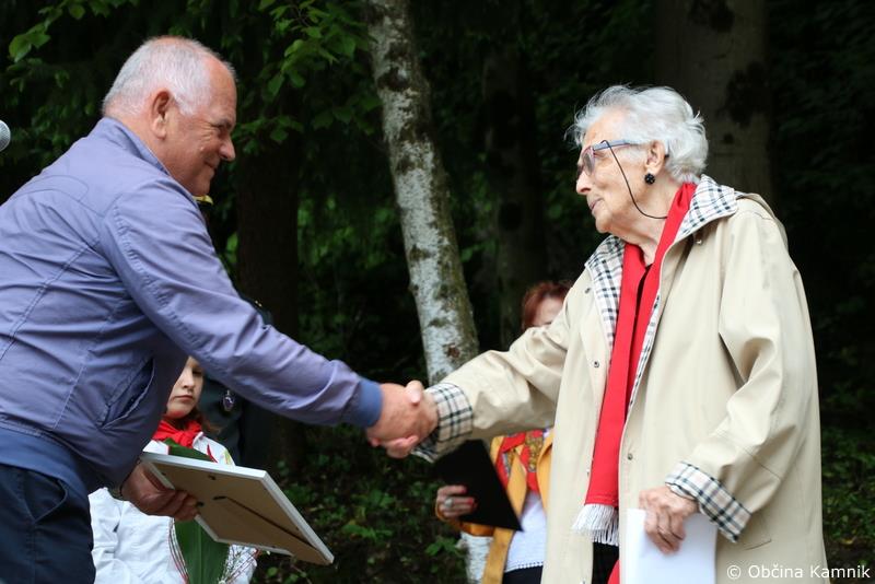 Dušan Božičnik in Jože Goltnik sta včerajšnji slavnostni govornici v imenu Združenja borcev za vrednoste NOB Kamnik predala priznanje in zahvalo ob 80. obletnici ustanovitve Osvobodilne fronte.